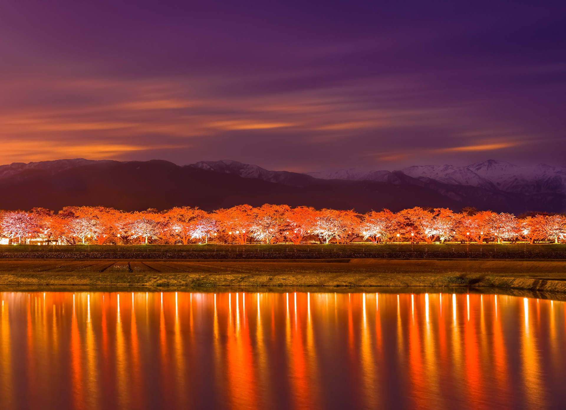 At night, the entire landscape is illuminated to allow people to celebrate *hanami* — the centuries-old Japanese tradition of viewing cherry blossoms.